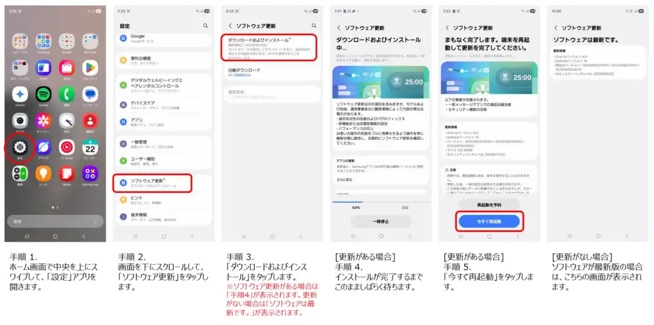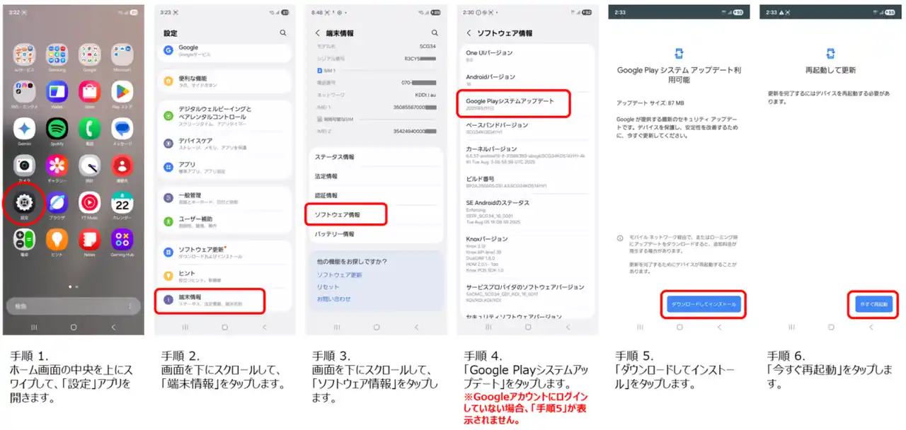 設定>端末情報>ソフトウェア情報>Google Playシステムアップデート>ダウンロードしてインストール>今すぐ再起動 |