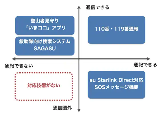 こうした「通信圏外」で「通報できない状況」でも、登山者の位置情報をいち早く家族や救助隊に届けられる手段の実現が課題になっていました。 なお、スマートフォン以外にも、衛星通信に対応した専用機器や捜索用の端末なども存在しますが、個人で携行するにはハードルが高く、全ての登山者が持つというのは難しい状況です。 |