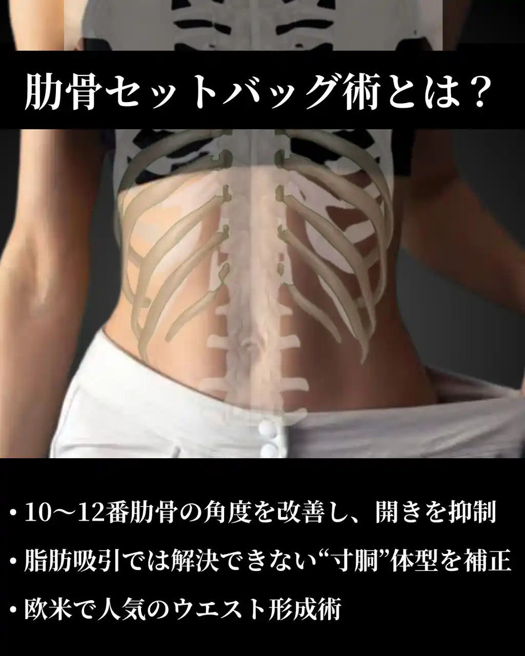 肋骨の開きにより、ウエストのくびれが消失している方 脂肪吸引を行っても、体型が寸胴に見えてしまう方 肋骨が張り出し、バストが4つに見えてしまう方 |