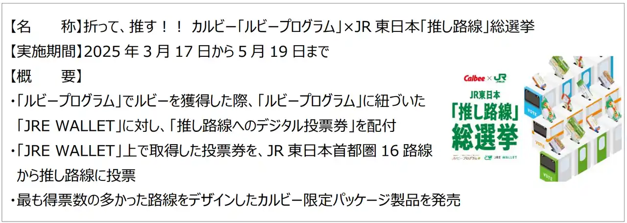〇JR東日本は、企業共創の一環としてカルビー株式会社が提供する「ルビープログラム」と連携した企画、『折って、推す!! カルビー「ルビープログラム」×JR東日本「推し路線」総選挙』を2025年3月17日から5月19日まで実施いたしました。 |