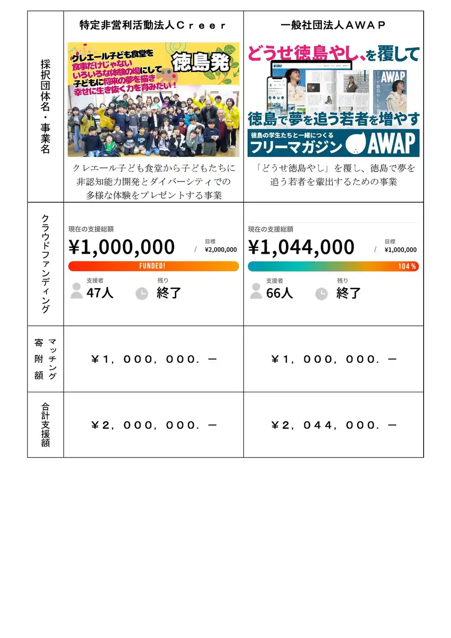 | 本事業に応募して採択された2団体が、クラウドファンディングに挑戦。両団体で204万円の寄附を集めることができました。 | ||||||||||||||