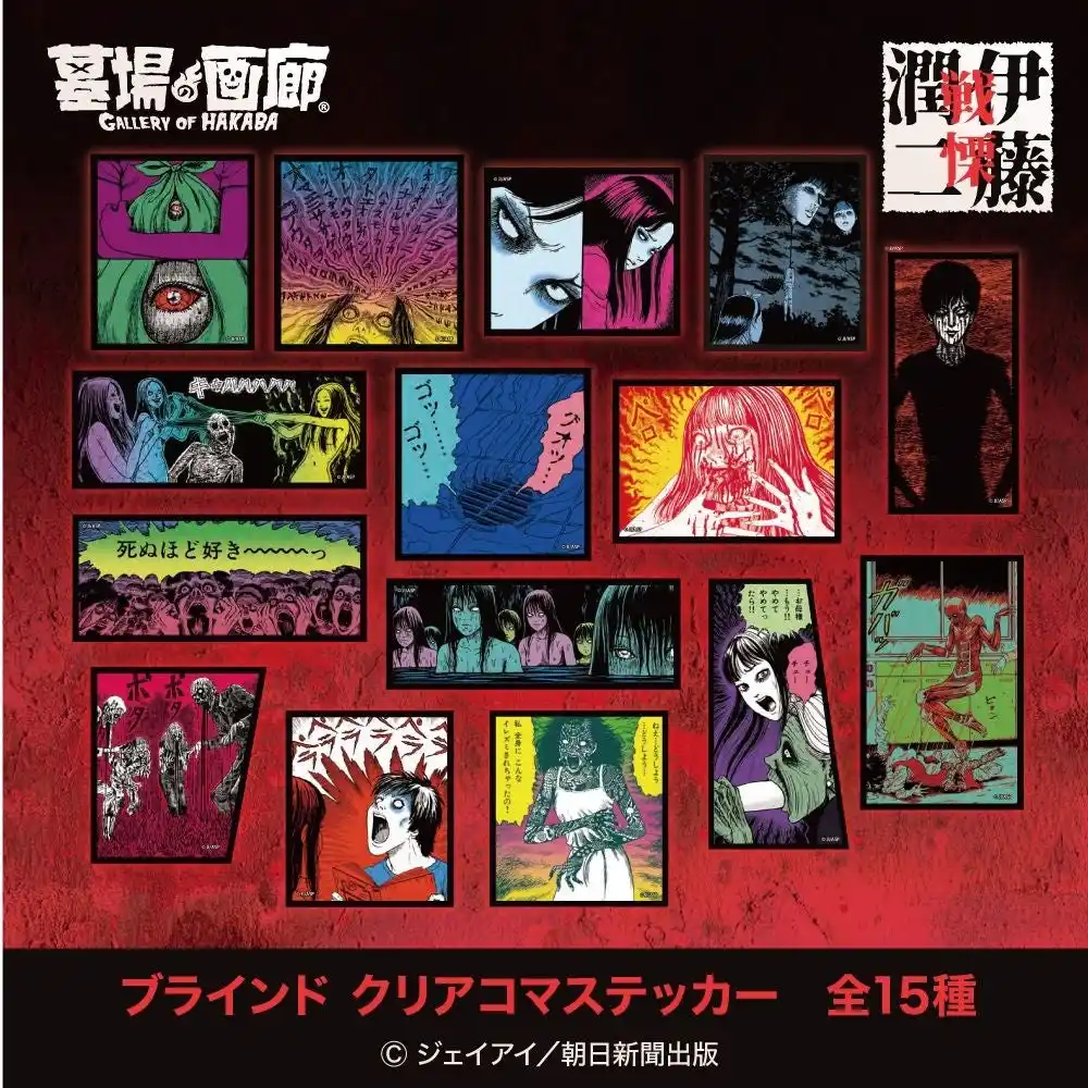 ブラインドクリアコマステッカー 全15種/各495円(税込) サイズ:最大W90mm×H82mm 瞼の裏に焼き付いて離れないショッキングな戦慄の名場面の数々を、ビビッドかつ不穏な配色でカラーリング! 伊藤潤二の作品世界が、鮮烈な耐水クリアステッカーで蘇る! |