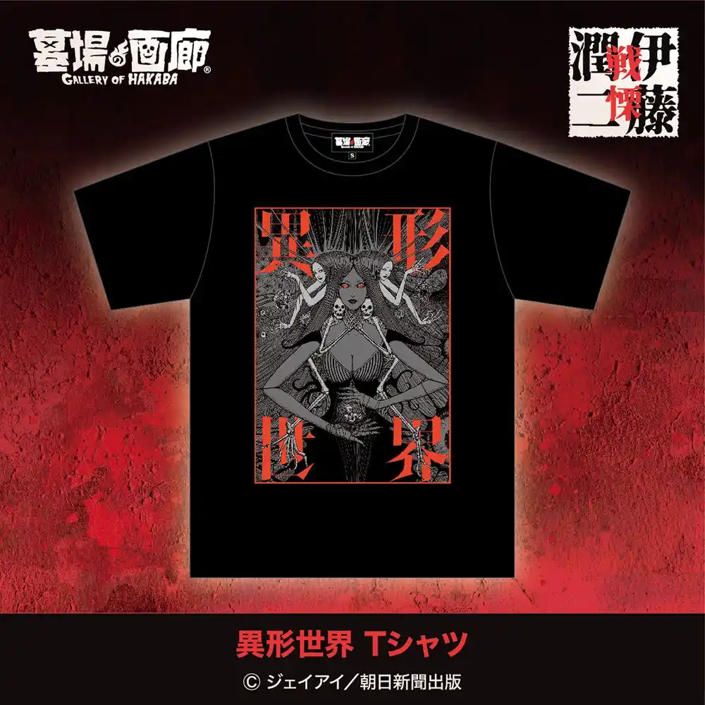 異形世界 Tシャツ/5,500円(税込) サイズ:S~XXL 日本を代表するホラー漫画界の巨匠・伊藤潤二の唯一無二の世界をまとめあげた画集「異形世界」のカバーイラストを大胆にTシャツ化! |