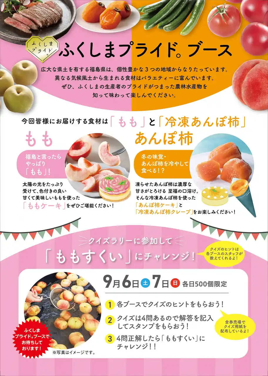 福島県農産物流通課では県民の皆様に旬の県産農林水産物の魅力をPRし、地産地消を推進する「おいしい ふくしま いただきます!」キャンペーンの一環として、2025年9月6日(土)と7日(日)に郡山市の21世紀記念公園 麓山の杜で開催される「ふくしまフードフェス2025」にブース出展し、旬の”もも”と”冷凍あんぽ柿”で作った料理を販売します! |