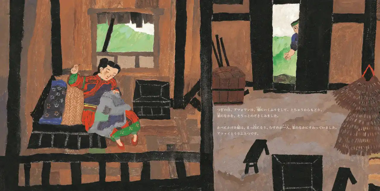でも、まずしくて、結婚することができません。 そこで絵師に、むすめの絵を描いてもらい、 アツァイと名づけて、毎日、話しかけていました。