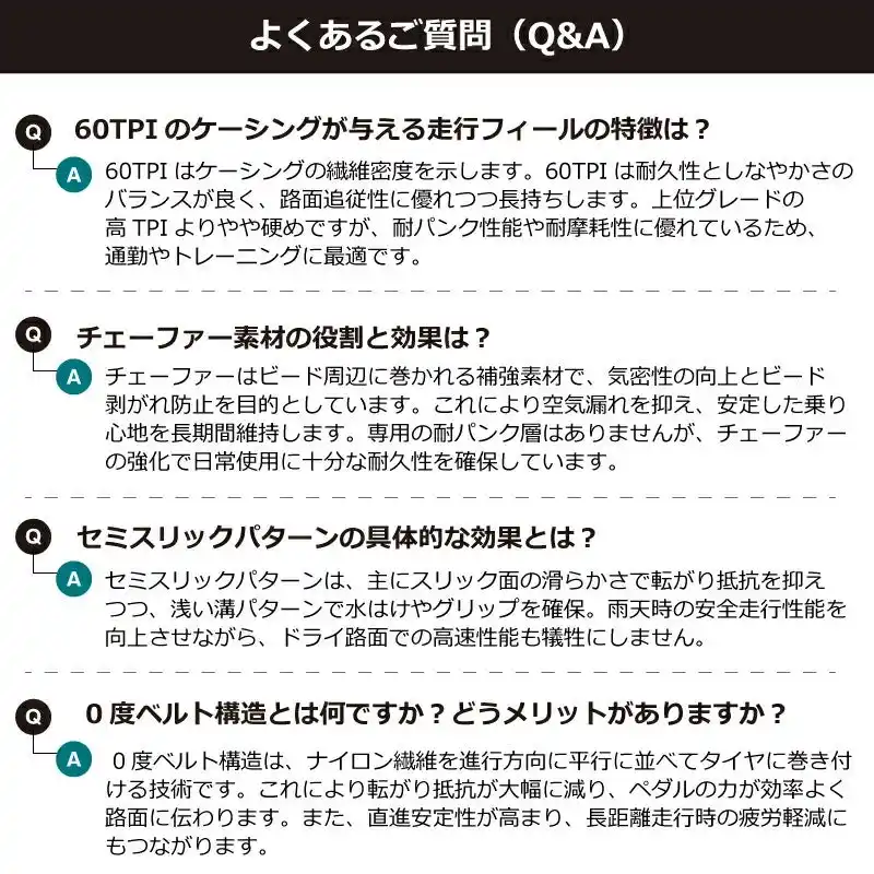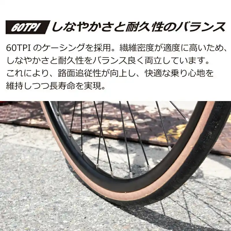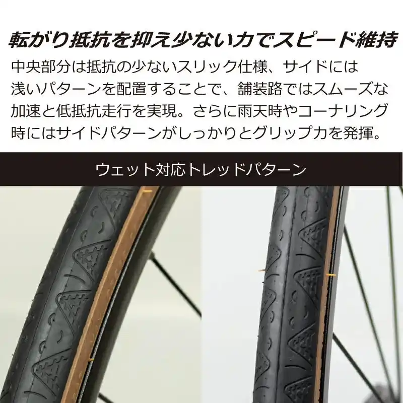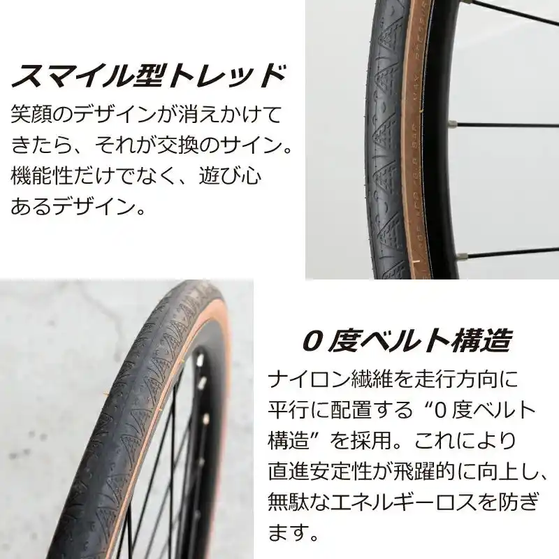 ・使用環境に応じて推奨空気圧を調整してください。 ・セミスリックパターンは雨天でも一定の排水性能を確保しますが、 深いパターンタイヤと比較するとウェットグリップは控えめです。 ・スマイル型トレッドパターンは摩耗の目安のひとつとして視認しやすいデザインです。 ・笑顔模様が薄くなったりほぼ消えた場合は、タイヤ交換の検討時期の参考にしてください。 ・摩耗状態の正確な確認はトレッド残量の定期チェックや、ひび割れ・ 損傷の有無も含めて専門的に行うことを推奨します。 ・専用耐パンクベルト非搭載のため、荒れた路面や未舗装路での使用時は 空気圧管理を徹底してください。 ・製品寸法はリム形状・使用条件により若干の差異があります。 ・タイヤは1本売りです。 |