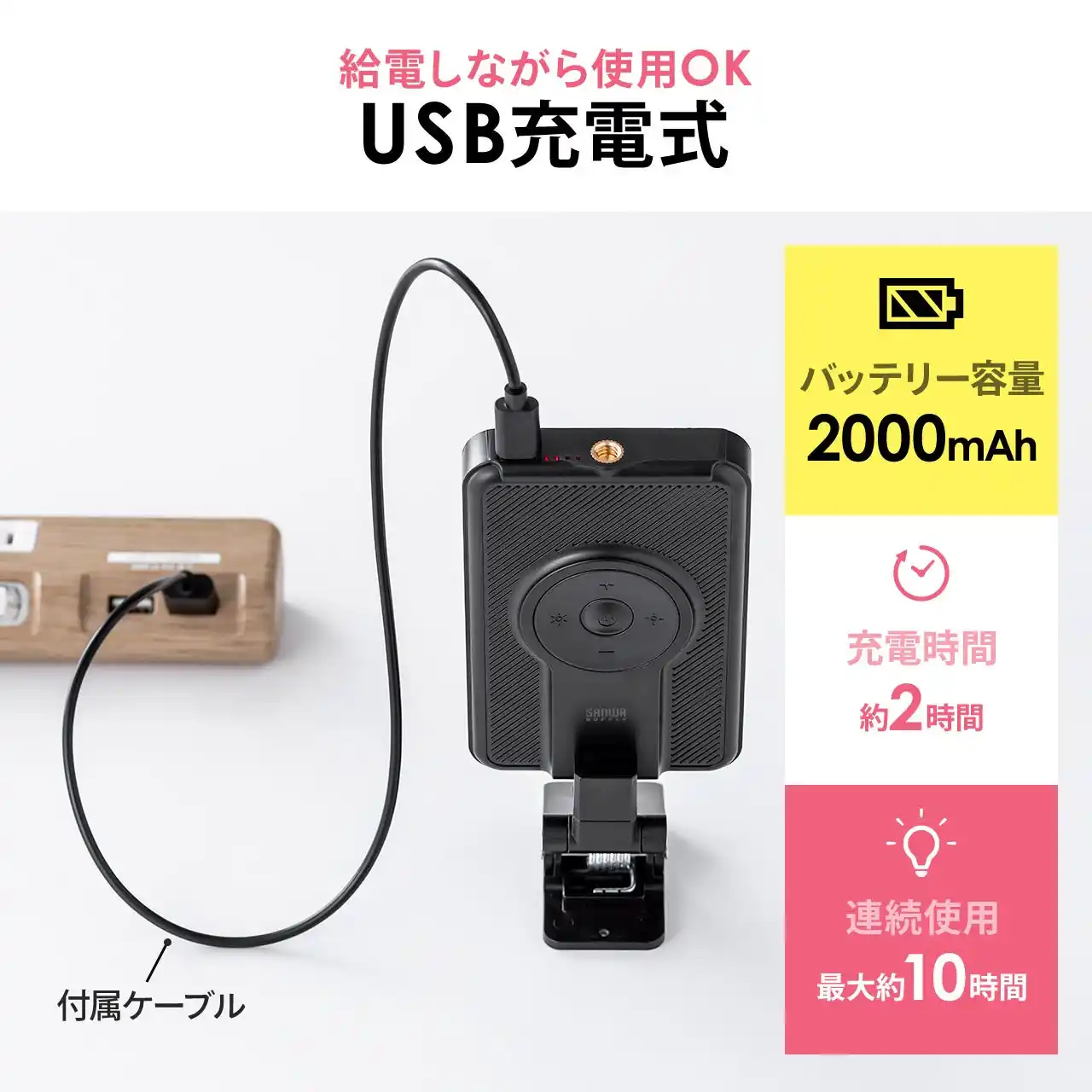 | 最大5時間使用可能なバッテリーを内蔵し、USBケーブルでの充電も可能な2WAY電源設計です。 | |||||