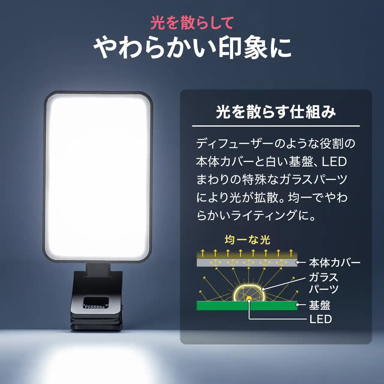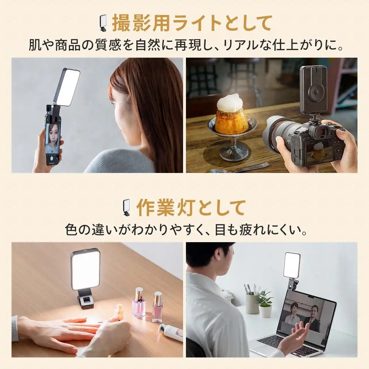 | YouTube動画撮影やSNS用のコンテンツ制作、Zoomなどのオンライン会議、テレワークなど幅広いシーンで使用可能です。Ra90の高演色性LEDを採用しており、自然な色味で被写体を美しく照らします。 | |||||