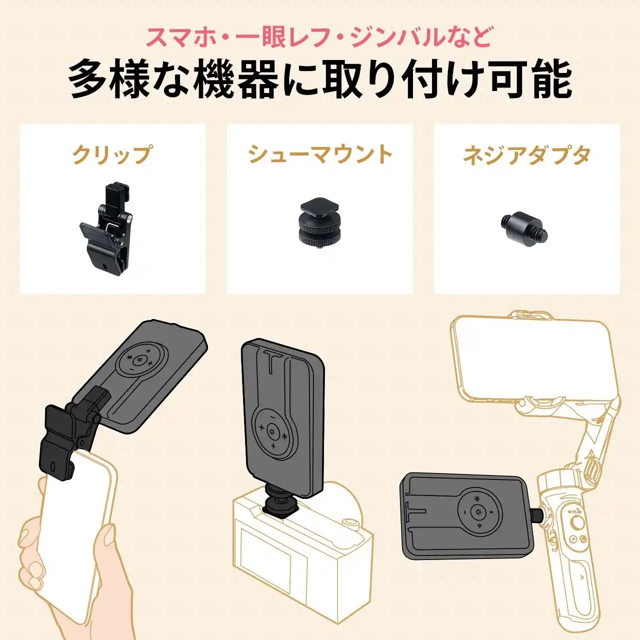 | スマートフォンや三脚、カメラホルダーなど、複数の機器に取り付け可能なマウント構造を採用しています。 | |||||