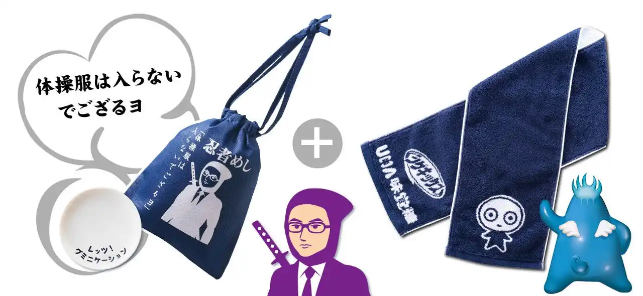 体操服は入らないでござるよ、グミを入れてね「忍者めし巾着」。サラダを盛るには小さすぎるよ、グミ専用「グミニケーション小皿」。第2弾ではさらに「シゲキックスタオル」もついています。お出かけ中のグミ好きアピールにぜひご使用ください。 |