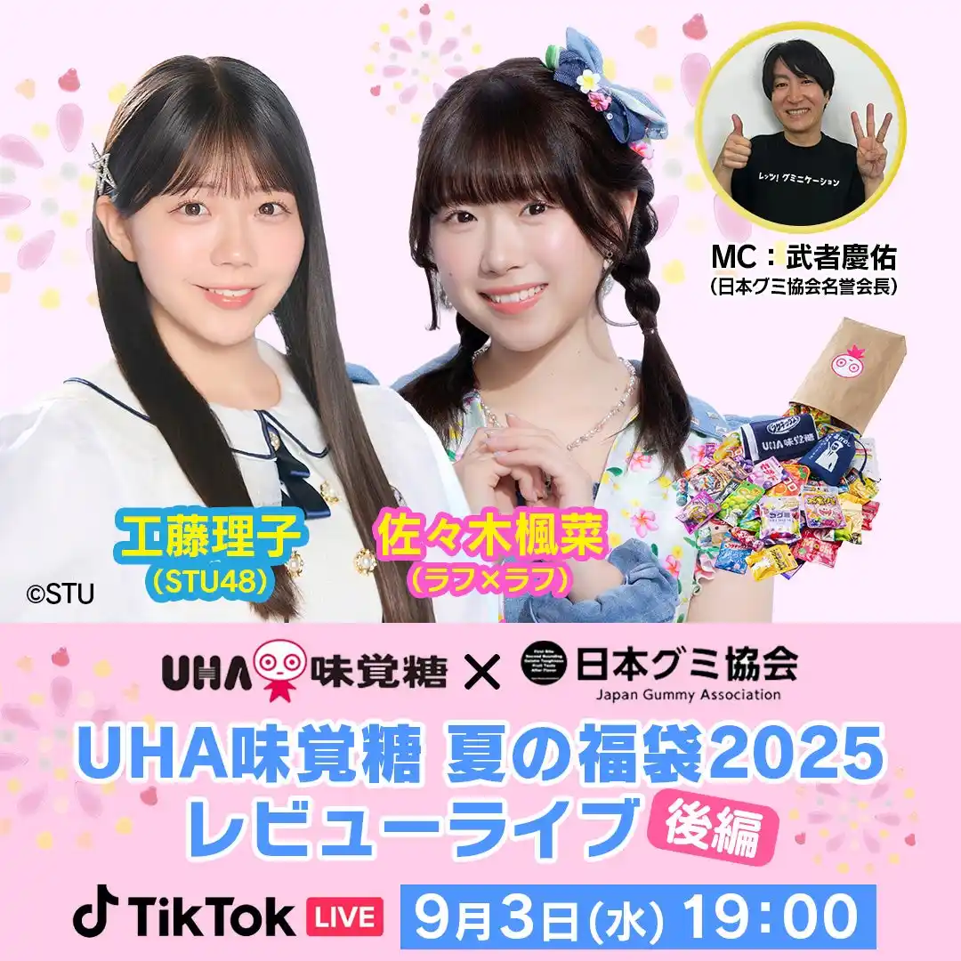 「UHA味覚糖 夏の福袋2025 第2弾」先行レビューライブにて、福袋の中身をいち早くご紹介します。今回の配信では、日本グミ協会名誉会長の武者慶佑さんをMCに迎え、さらに日本グミ協会名誉会員の、STU48の工藤理子さん、ラフ×ラフの佐々木楓菜さんをゲストに招いた超豪華メンバーでお送りします。ご購入を検討されている方、中身が気になる方は、ぜひご覧ください! |