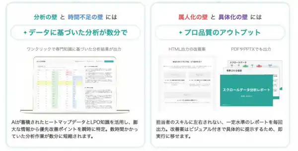 これにより、これまで専門的なリソースを有する企業や専門コンサル会社の支援でしか実現できなかった高度な分析作業を、専門の知識を持った担当者がいない企業でもワンクリックで実行できるようになります。結果として、デジタルマーケティングにおける膨大なデータ分析作業の効率化を行い、誰もが効率的かつ成果の出るサイト運営を可能にすることを目指しています。