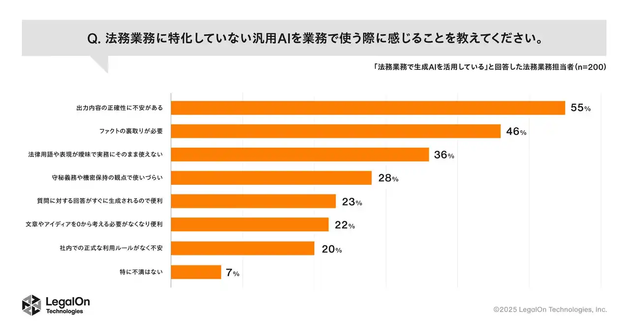 生成AIを法務業務で活用する際に期待することは「信頼できる回答が生成されること」。汎用AIを法務業務で使う際に感じることは「出力内容の正確性に不安がある」「法律用語や表現が曖昧で実務にそのまま使えない」。