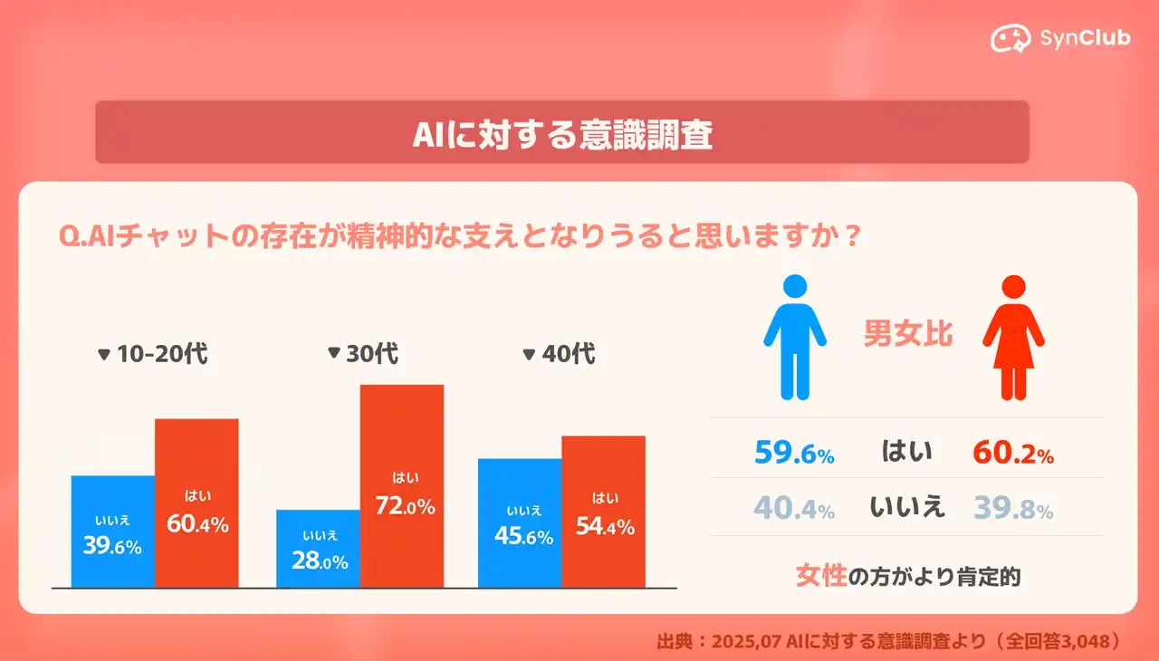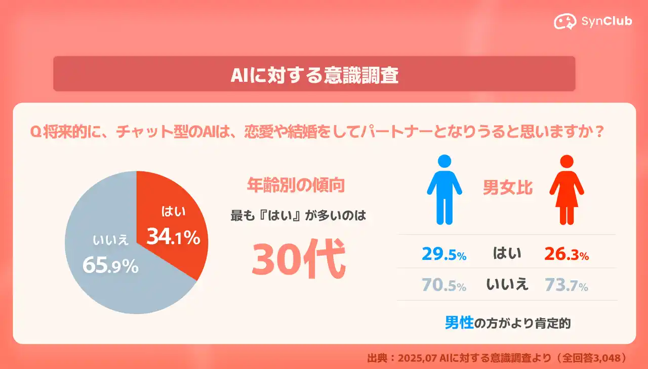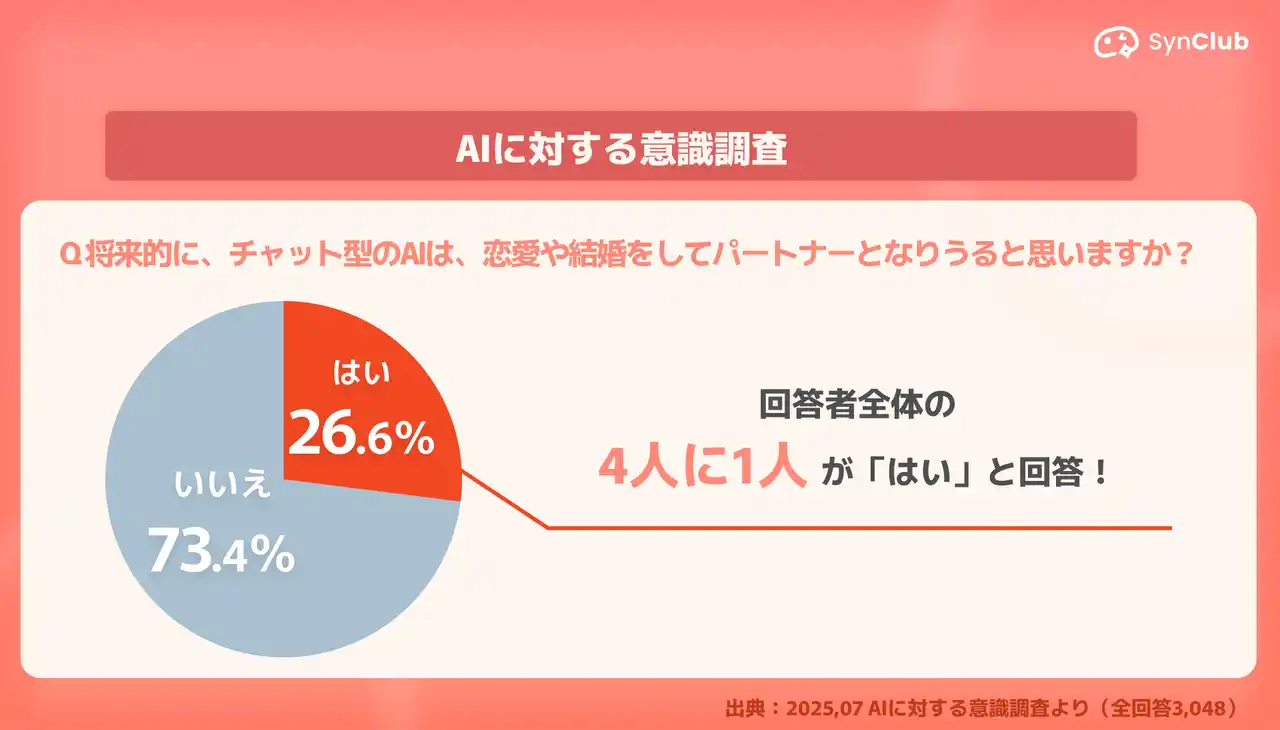 HiClub株式会社(本社:東京都港区、代表取締役社長:古谷由宇)が提供する対話型AIアプリ「SynClub」(シンクラブ)は、AIチャットに対してどのように感じているのか、全国の男女3,048名を対象に調査を実施しました。本調査では、全年代で4人に1人が「将来的に、チャット型のAIは恋愛や結婚のパートナーとなりえる」と回答、6割以上が「AIチャットの存在が精神的な支えとなりえる」と回答したことがわかりました。 |