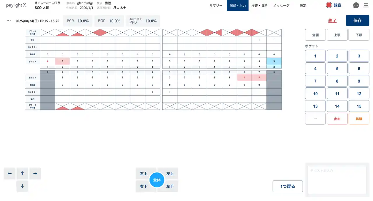 歯周組織検査の専用画面は、複雑な操作を必要とせず、誰でも迷わず使いこなせるシンプルで洗練された設計です。プラークコントロールレコード(PCR)・歯周ポケットからの出血の割合(BOP)・ |