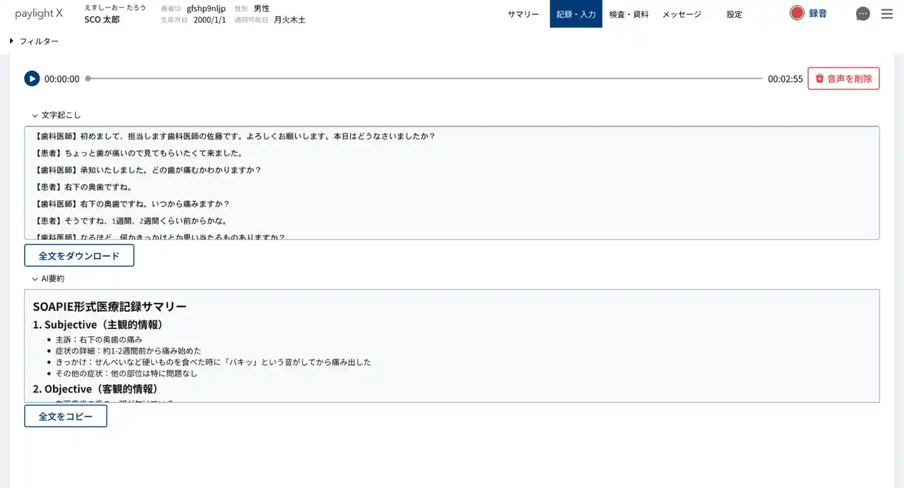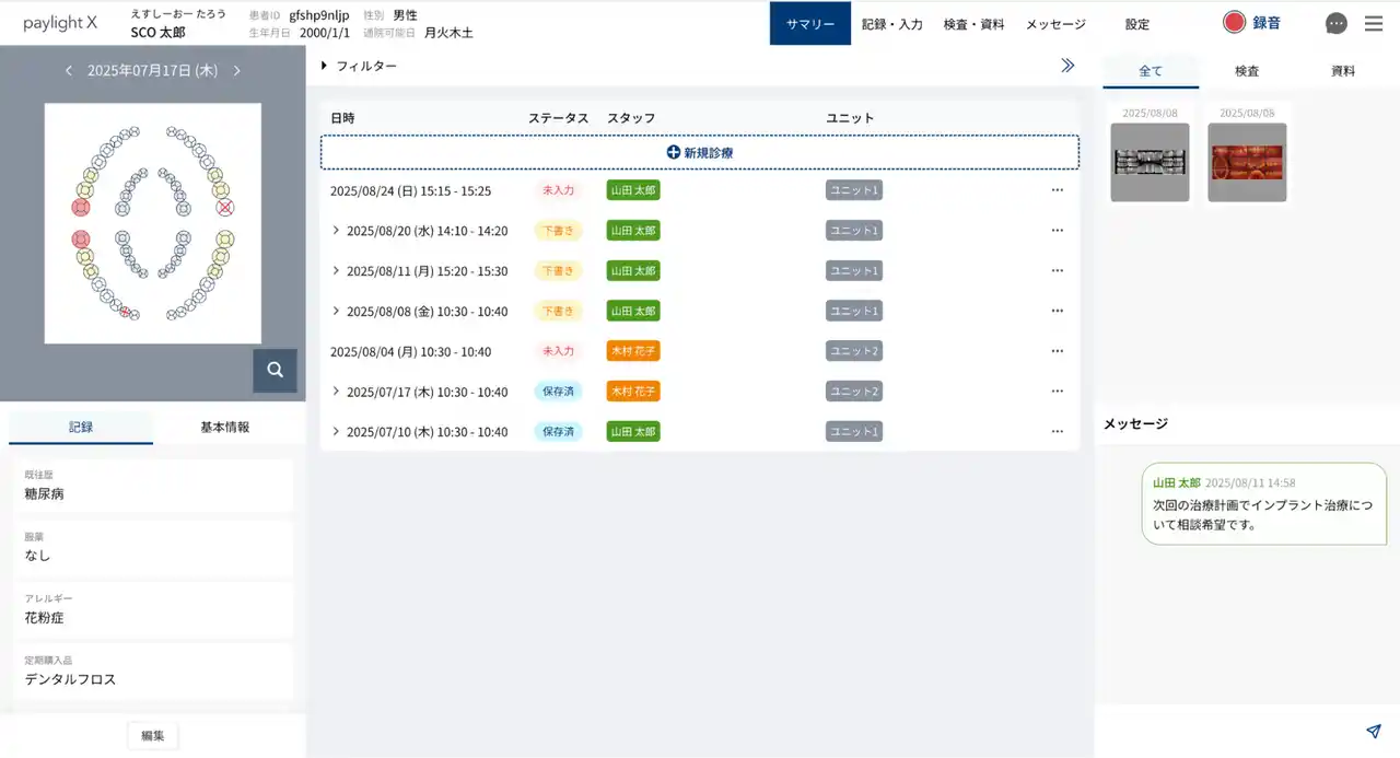 株式会社SCOグループ(本社:東京都千代田区、代表取締役会長:玉井雄介、以下「SCOグループ」)は、2025年6月30日に提供を開始した歯科医院向けオールインワン プラットフォーム「paylight X」を独自開発したAI技術を用いて記録入力作業の効率を最大化するアップデートをお知らせいたします。 |