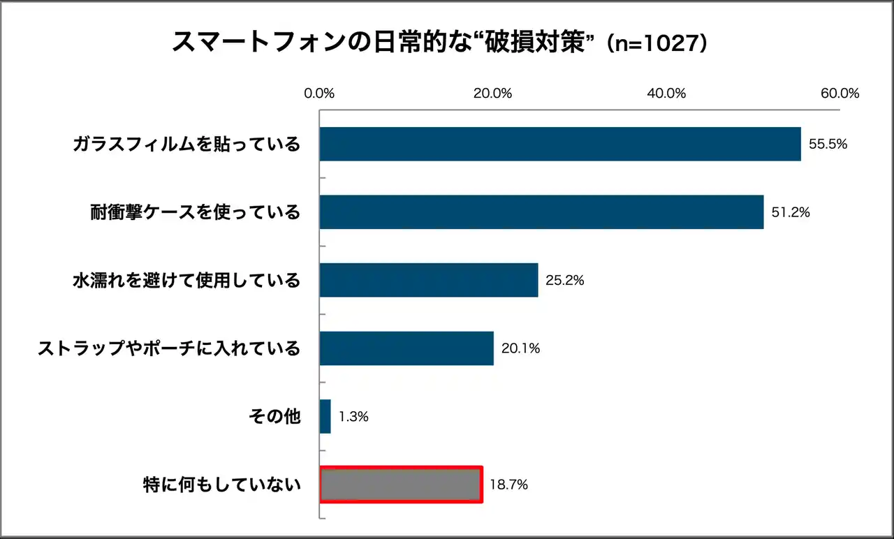 スマートフォンの日常的な破損対策は、「ガラスフィルム(55.5%)」、「耐衝撃ケース(51.2%)」が二大対策。「水濡れを避けて使用する(25.2%)」、「ストラップ・ポーチに入れている(20.1%)」も一定数います。一方で「特に何もしていない」18.7%。不安はあるのに対策が追いつかない層が約2割存在しました。 |