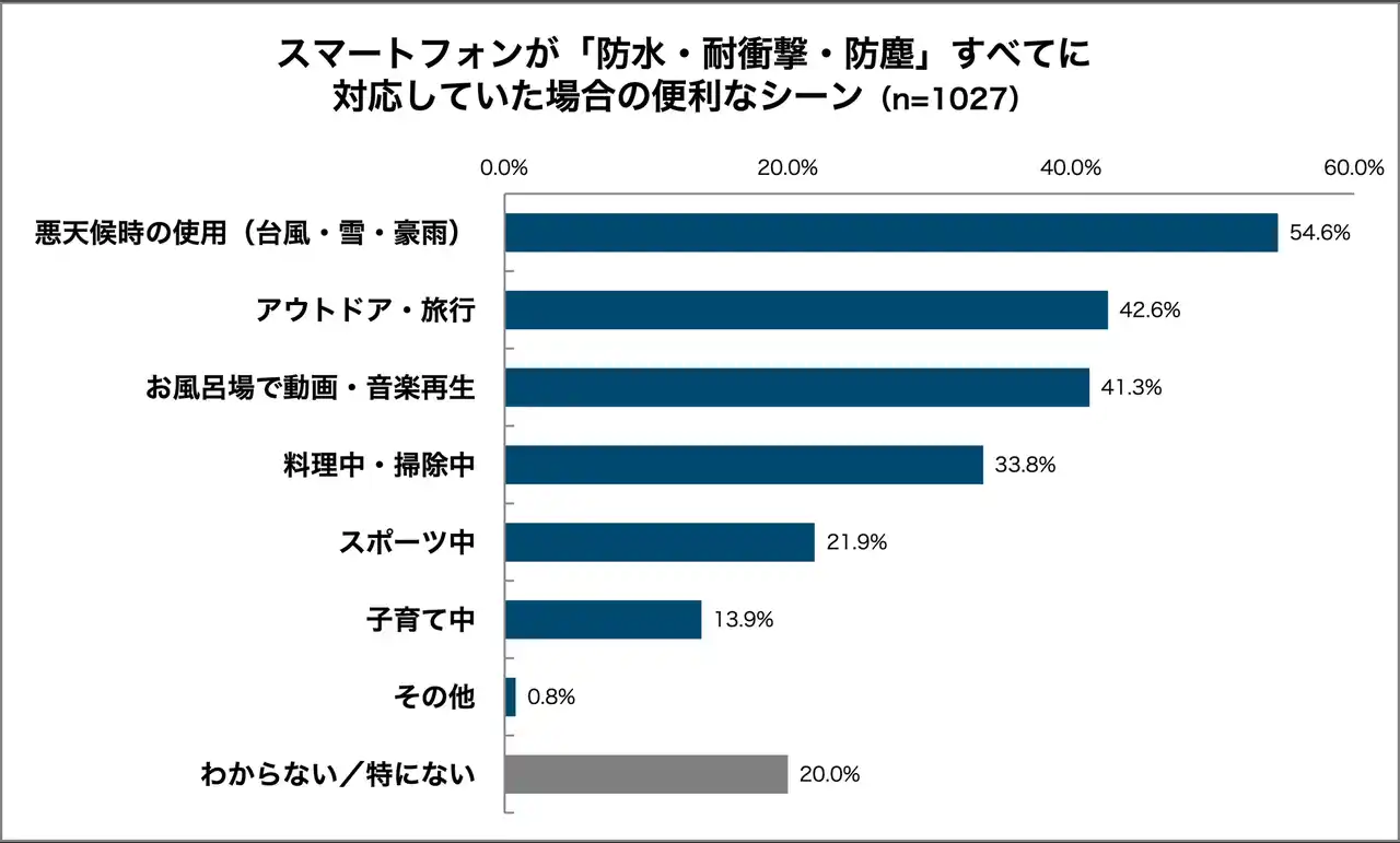 お持ちのスマートフォンが“防水・耐衝撃・防塵”全てに対応していた場合、どんなシーンでが役立つか尋ねたところ場面、「悪天候時の使用(54.6%)」、「アウトドア・旅行(42.6%)」、「お風呂場での動画・音楽再生(41.3%)」が上位に。特別な用途というより、濡れる・汚れる・落とすが起きやすい生活の現場でのニーズがはっきり見えます。 |