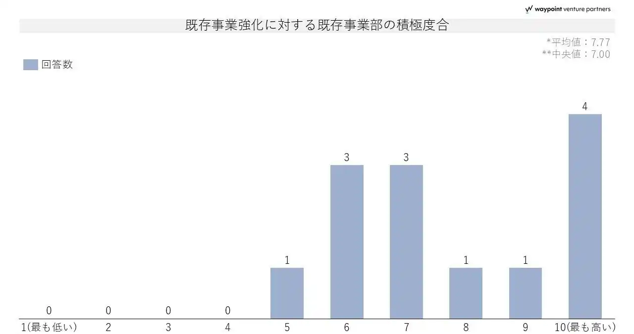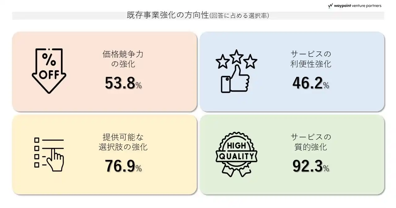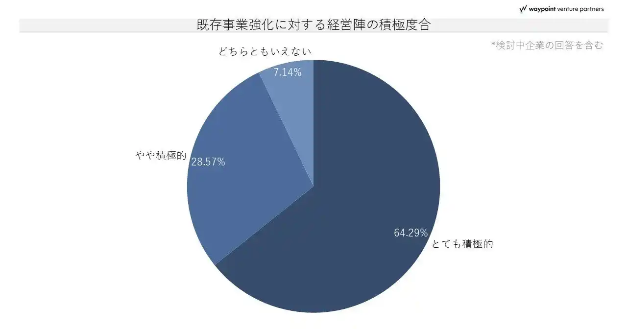 ・既存事業強化に取り組む方向性は「サービスの質的強化」が9割超だが、取り組む背景ごとに方向性にも傾向がある ・メリットが分かりやすい既存事業強化に対する経営陣の積極度は9割を超え、既存事業部の積極度も高い |