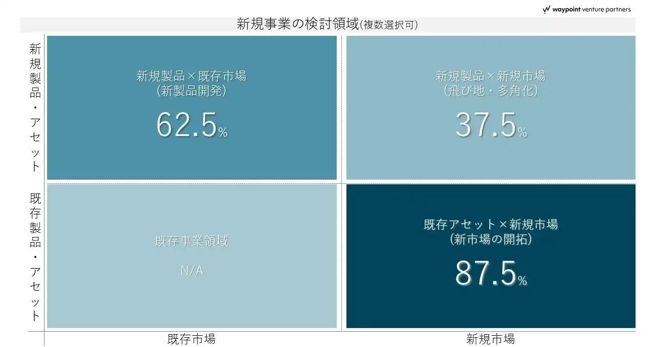 ・新規事業に取り組む背景は「既存市場縮小」が9割超 ・新規事業の検討領域は、堅実に、既存市場や既存製品・アセットと掛け合わせた領域でのチャレンジが多く見られる |
