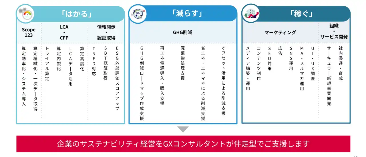 GXリテラシーと生成AIやローコード・ノーコードなどのモダンテクノロジーを使いこなすデジタルスキルを兼ね備えたGX人材が企業の現場で伴走し、脱炭素DX推進を支援。GX人材、LCAをもとにしたサービス・デザインチーム、脱炭素DXマーケティング、脱炭素DX人材育成、LCA算定支援などを提供しています。 |