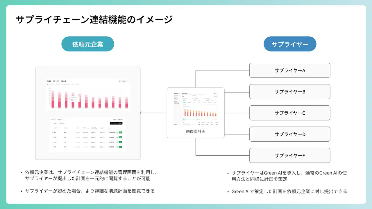 『Green AI』を活用することで、企業が「脱炭素」と「コスト削減」を両立する具体的な施策を策定し、CO2削減の実行を推進いたします。さらに、『Green AI』が内包するサプライチェーン連結機能を活用し、各企業の脱炭素化だけではなく、サプライチェーン全体における脱炭素化の実現を目指した取り組みを推進します。 |