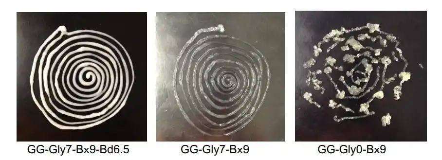 グリセリンと同様に複数の水酸基を持つ糖類(例:グルコース)を加えることで、同様の物性改善が可能であることを確認しました。また、木工用ボンドの代替としてガラスビーズなどの微粒子を加えても、延伸性が向上することが確認されました。 |