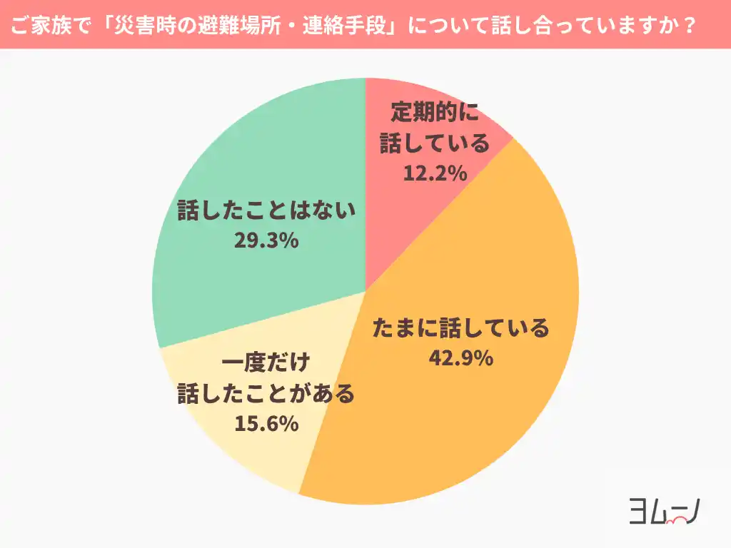 | また「話したことはない」と回答した方は29.3%と、およそ3家庭に1家庭にのぼり、災害時に家族間での連携について懸念される結果となりました。 | |||