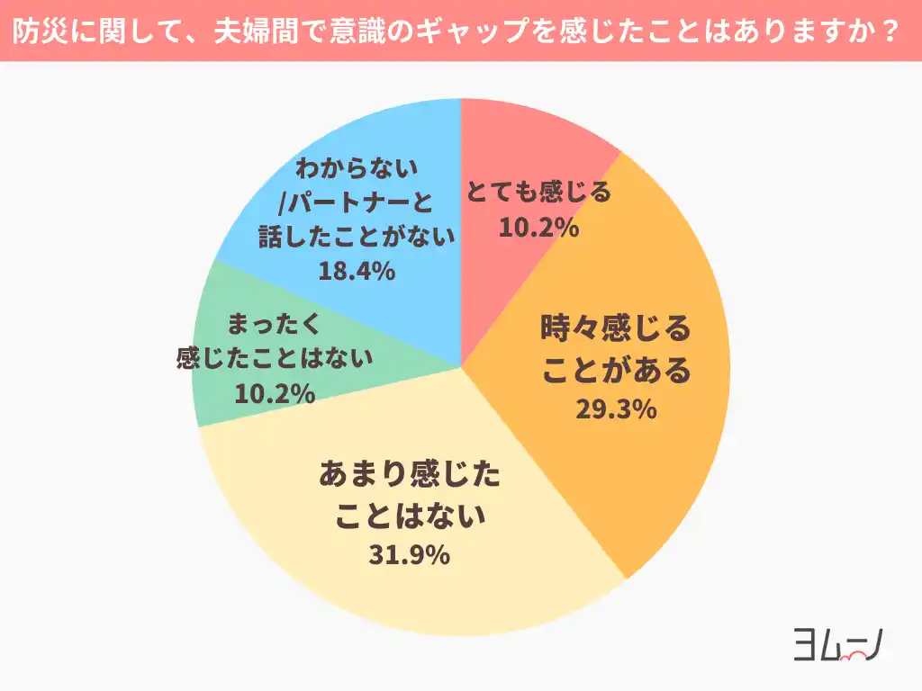 | 防災に関して、夫婦間で意識のギャップを「あまり感じたことはない」という方が31.9%で最も多かった一方、「時々感じることがある(29.3%)」「とても感じる(10.2%)」を合わせると、約4割が“夫にモヤモヤ”を感じていることが分かりました。 | |||