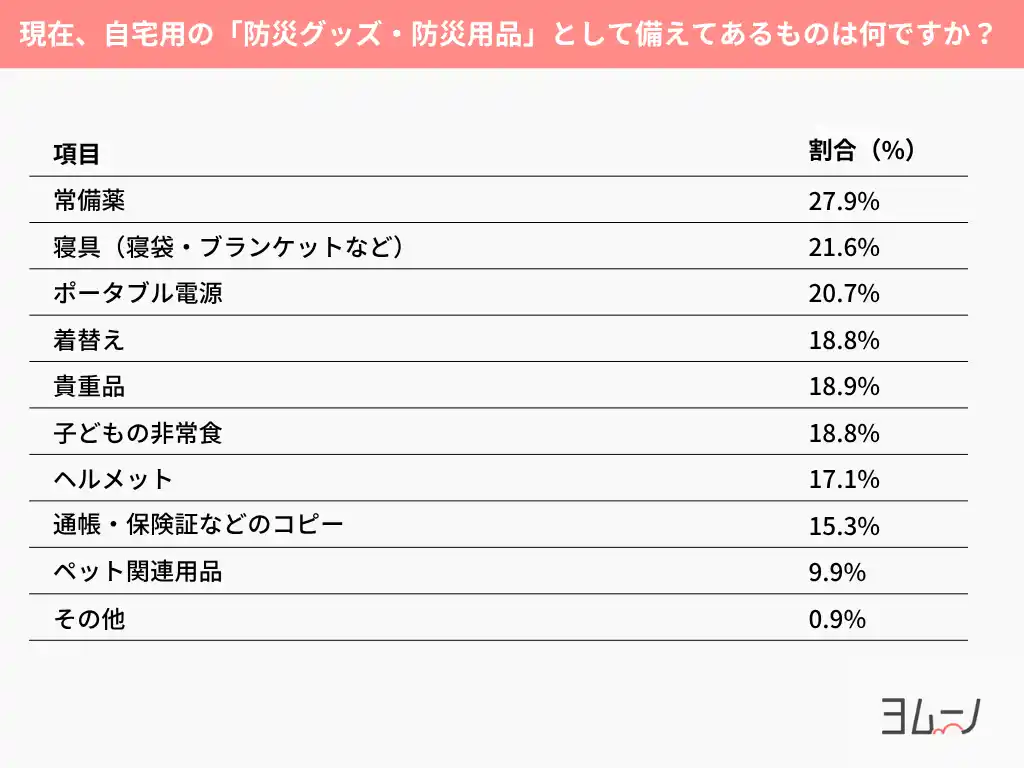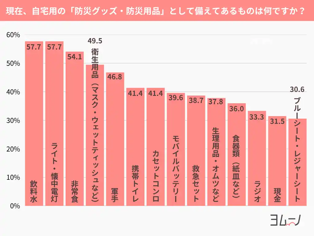 | さらに、「モバイルバッテリー(39.6%)」「救急セット(38.7%)」も3割台後半と、情報収集や応急処置といった“もしも”を想定した備えも取り入れられていました。 | |||