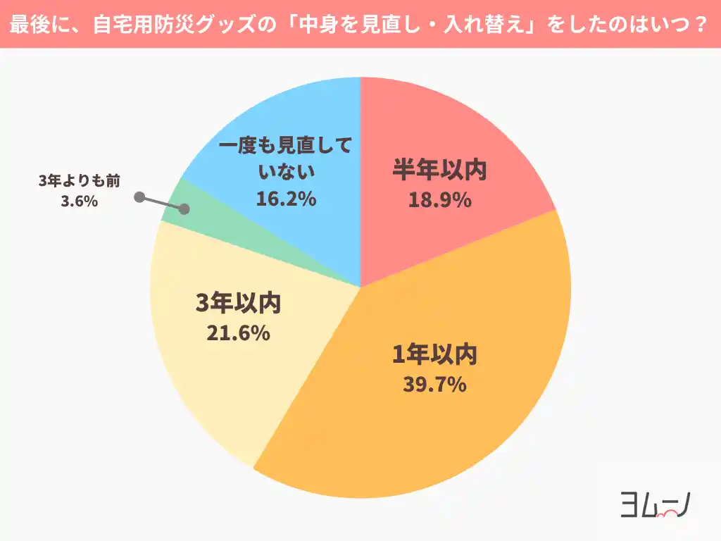 | 3)防災グッズの見直しは「半年以内」「1年以内」が約6割。一方で2割が“長期間未確認” | |||