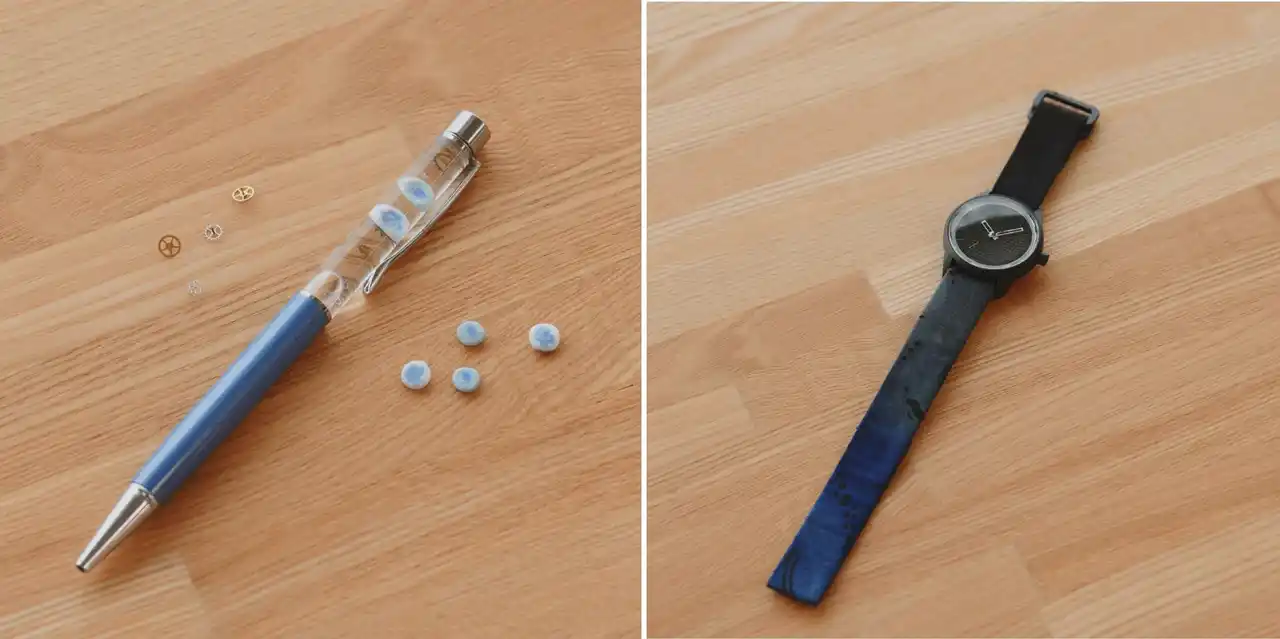 ワークショップ試作品(左:ハーバリウムボールペン/右:腕時計のストラップ) |