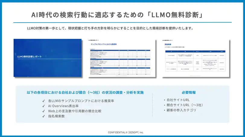 本サービスの提供開始にあわせ、AI時代の検索行動に適応するための「LLMO無料診断」のモニターを先着20社限定(※3)で募集いたします。 |