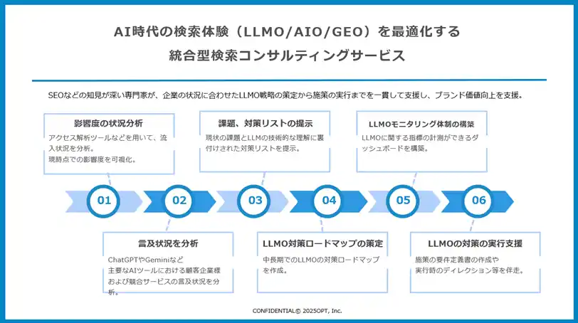 本サービスは、AI時代の検索体験(LLMO/AIO/GEO)の最適化を目指し、自社サイトのSEM(リスティング広告やSEO)及びLLM(大規模言語モデル)への対応状況を専門のコンサルタントが多角的に分析し、SEMやLLMO対応の戦略策定および実行支援を行うサービスです。これまでのGoogleを主体としたSEMだけでなく、AIが生成する検索結果における顧客企業のプレゼンスを可視化。AI時代の新たな検索体験に最適化するための課題の洗い出し、その課題解決に向けた戦略の立案から実行までを、専門のコンサルタントが伴走いたします。 |