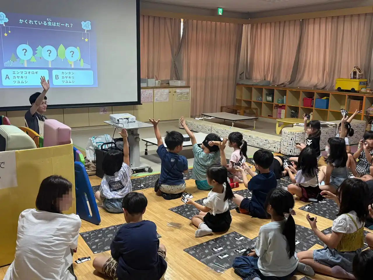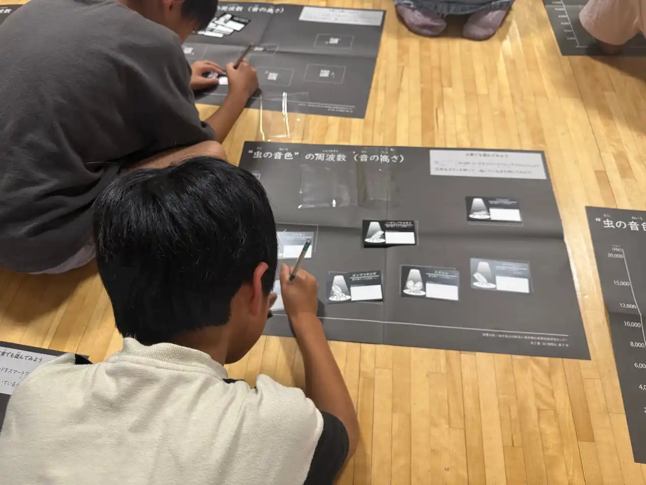 むしのねオノマトペで自分たちが表現した虫の声をヒントにしたり、友達や先生と協力して一緒に答えを考えたりしながら参加するクイズでは、大人が聞こえない高い鳴き声のツユムシが鳴いた場面で、聞こえていない大人たちの様子を見て、「聞こえていないの?」と不思議そうな表情をする参加者もおり、“聞こえ”への関心が高まった様子をうかがうことができました。 |