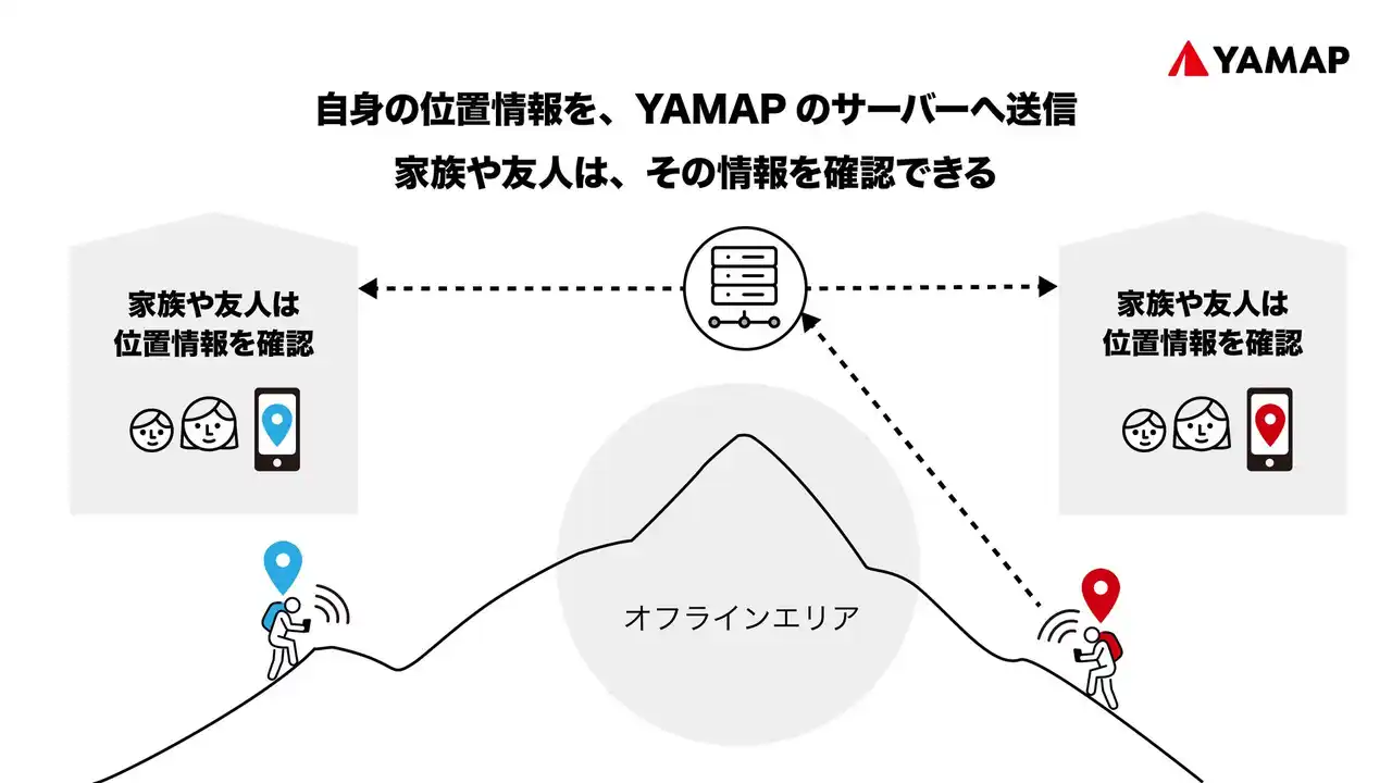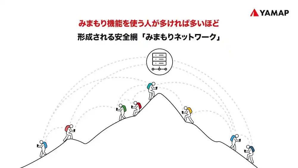 オンラインのYAMAPユーザーが増えることで、Bluetooth通信を活用したユーザー間での位置情報交換システム「みまもりネットワーク」が、より精緻になります。登山者が万が一遭難した際でも、遭難時の位置情報がより正確に特定でき、迅速な救助・発見につながることが期待できます。 |