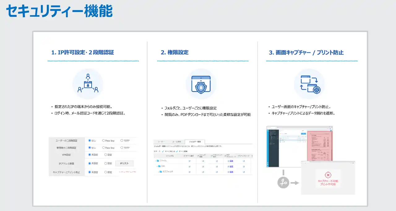 高いセキュリティ水準(通信暗号化・アクセス権限設定・操作ログ管理) |