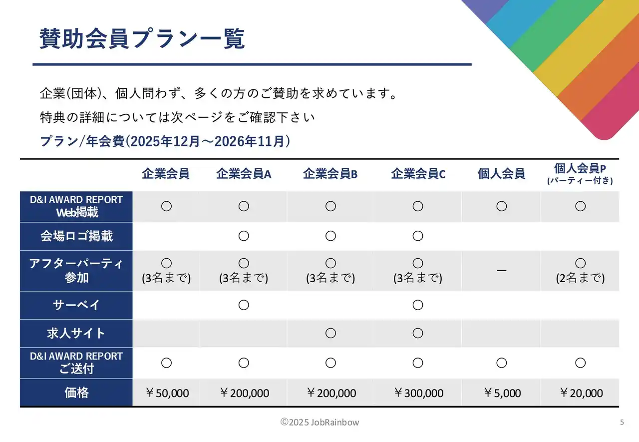 以下の画像のとおり、企業会員プランが4種類、個人会員プランが2種類ございます。プランに応じて特典内容と価格が変わって参ります。詳細はD&I AWARD賛助会員のお願いの資料をご参照ください。 |