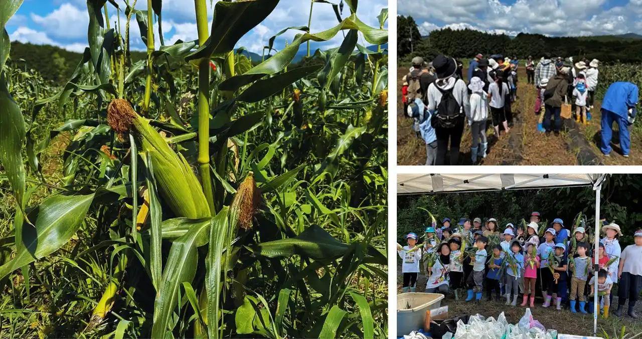 静岡県内で「お~いお茶」など茶系飲料の生産時に排出する副産物「茶殻」を富士宮市で堆肥化。富士宮市や生産者の協力のもと、この茶殻堆肥を使用したトウモロコシを栽培し、親子19組約60名を対象としたトウモロコシ収穫体験を実施しました。富士宮市は乳牛が多い市町村であることから畜糞処理が課題で、本取組みにより地域課題の解決の一助として貢献するとともに、参加者の皆さまに食育活動を通じて野菜作りの楽しさを感じていただきました。 |