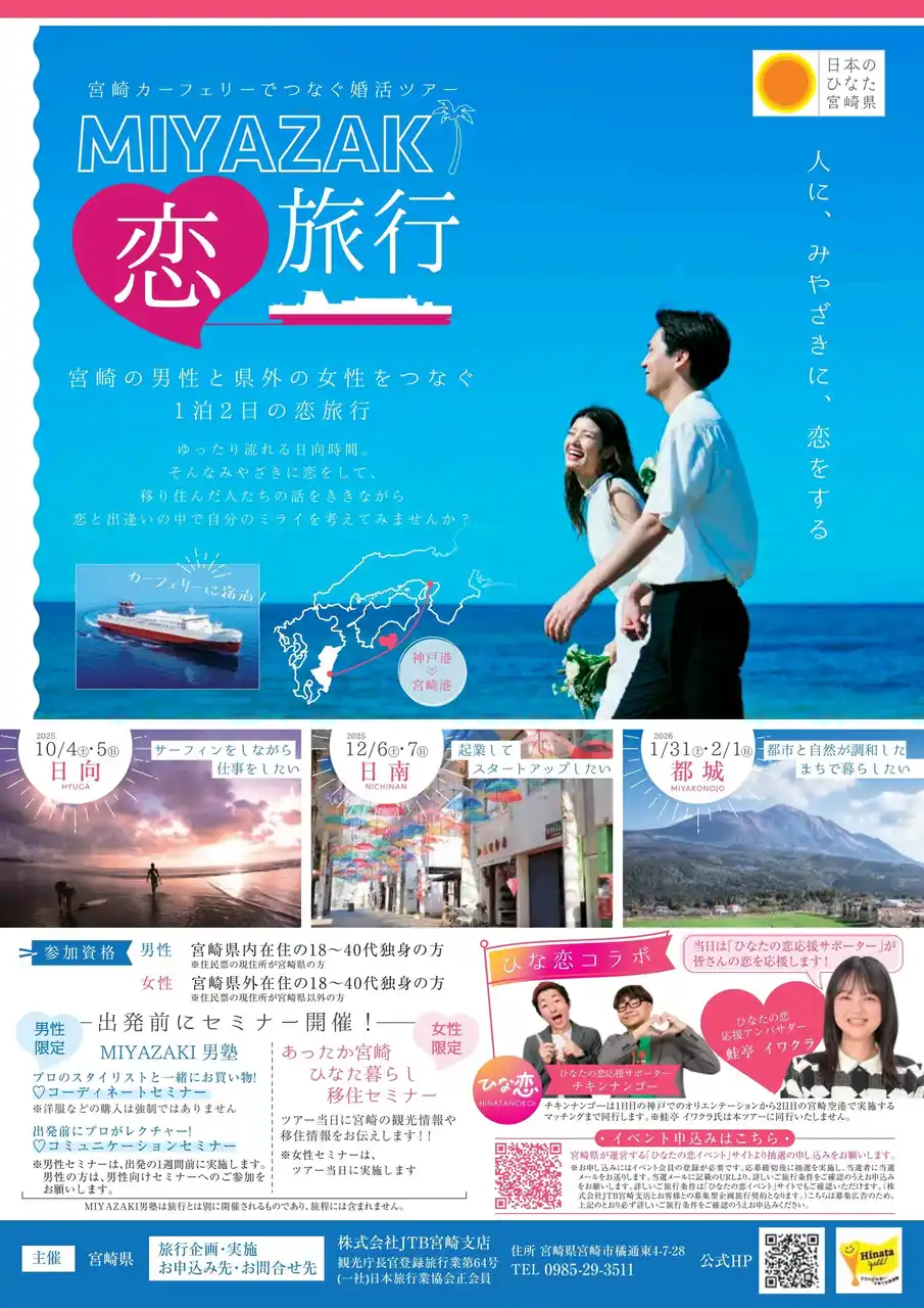 宮崎県が行う「みやざきカーフェリーでつなぐ婚活ツアー事業」の一環として、株式会社AVC放送開発がイベントの企画・実施を、株式会社JTB宮崎支店が旅行の企画・実施を行います。 |