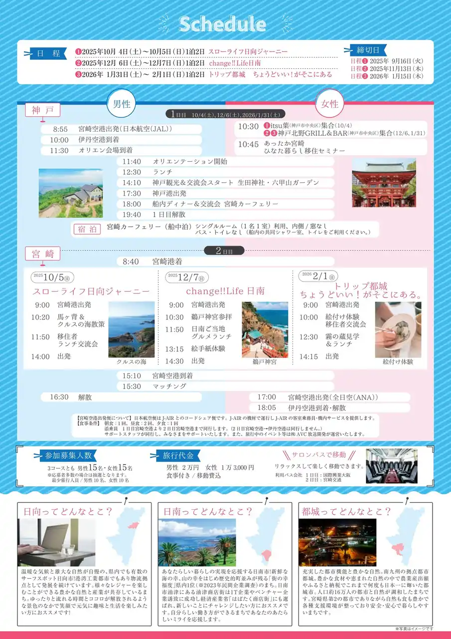 宮崎県内在住の男性×県外在住の女性を対象に、1泊2日の婚活イベント・旅行を実施します。 |