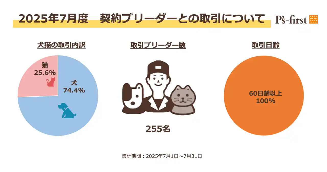 P’s-first直営店では、オークションなどの第三者を経由せず、全国の信頼できる契約ブリーダーからペットを直接取引しています。2025年7月1日から7月31日までにペッツファーストグループが取り扱ったペット、すなわち契約ブリーダーから引き受けたペットの頭数が1,190頭、そのうち犬が74.4%、猫が25.6%です。なお、7月度に引き受けたペットたちは255名の契約ブリーダーと取引いたしました。 |