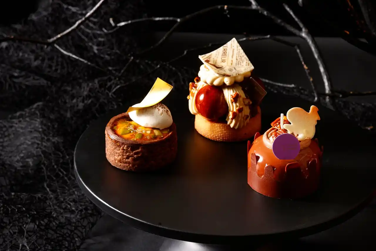 「エラーブル・エ・ペカン」はシュクレのリングの中にココアのパイ生地を配し、ピーカンナッツの香ばしい風味が味わえます。艶やかなシューにはカシスの甘酸っぱいクリーム、相性のよいメープルシャンティーが秋の訪れを感じさせる一品です。「パンプキン・バスク・パイ」はココアのパイ生地に、カボチャをあわせたコクのある甘さのバランスが絶妙なバスクチーズパイです。「ファントム・ノワール」はゴーストをモチーフにし、キャラメルムースとカルダモンのガナッシュの中にリンゴのコンポート、パッションフルーツのクリームをあわせたエキゾチックで爽やかな風味をお楽しみいただけます。 |