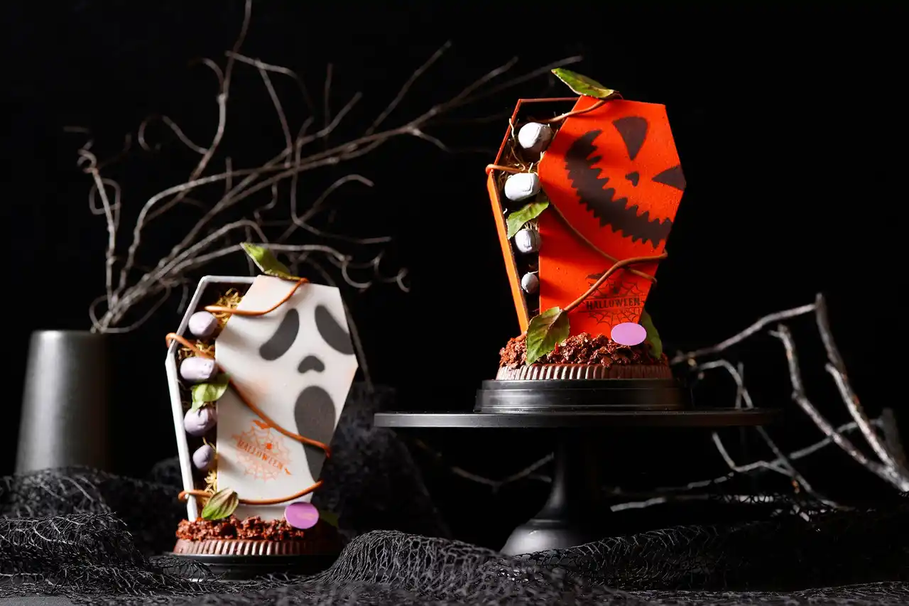 ハロウィンチョコレート「Mr.Scream」と「Mr.Jack」はハロウィンの夜、パーティーに参加しようと墓場からこちらの様子を伺っているシーンを象ったチョコレート細工です。棺桶の中にはサクサク食感のカダイフと濃厚で香ばしいアーモンドショコラを詰め、リアリティ溢れるおばけの指も上質なチョコレートで仕上げました。ハロウィン当日まで飾ってお楽しみいただいた後に召し上がっていただくのもおすすめです。 |