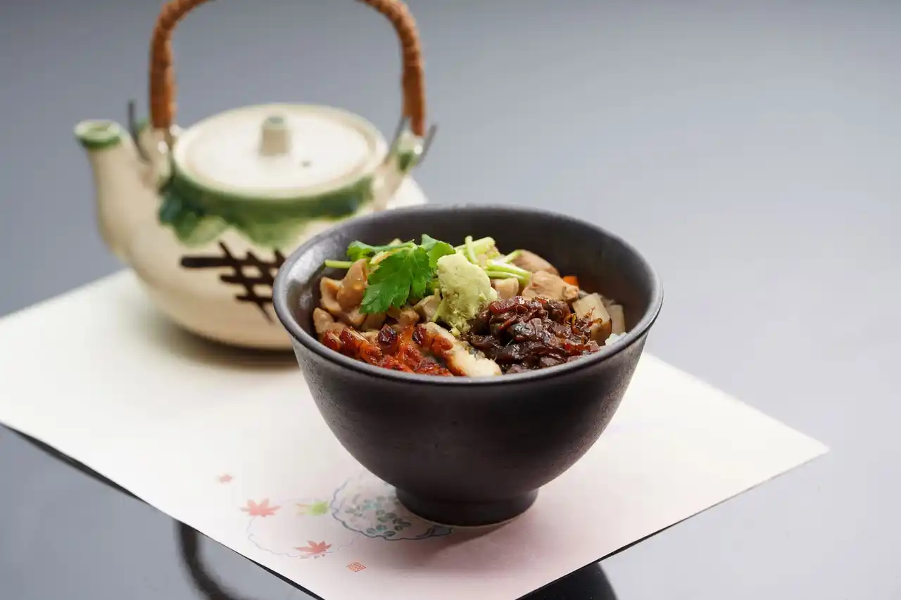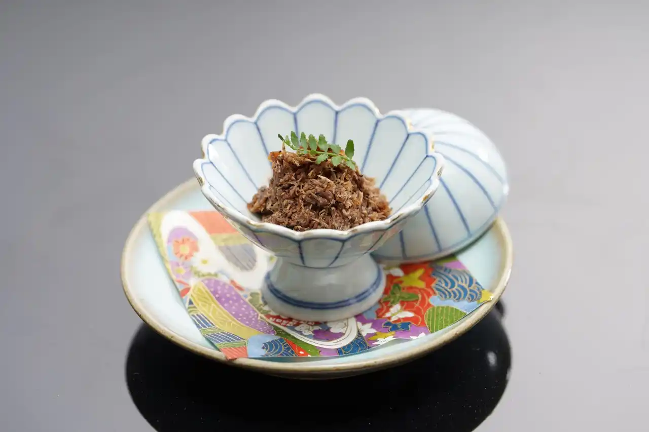 | 今回の御膳では、島根の豊かな風土が育んだ希少な食材をふんだんに使用しています。例えば「奥出雲舞茸」は名水「延命水」を使用して栽培し、香り高く力強い食感が魅力です。益田市で丹念に肥育される「まつなが牛」は、上質で甘みのある脂・旨味が際立ちます。そして、「日本五大名飯」のひとつに選定された「うずめ飯」は、倹約の時代に贅沢を隠す工夫から生まれた料理という説もあります。こうした島根の旬と食文化を一度にご堪能いただける贅沢な御膳です。 | |||||||||||||||||||