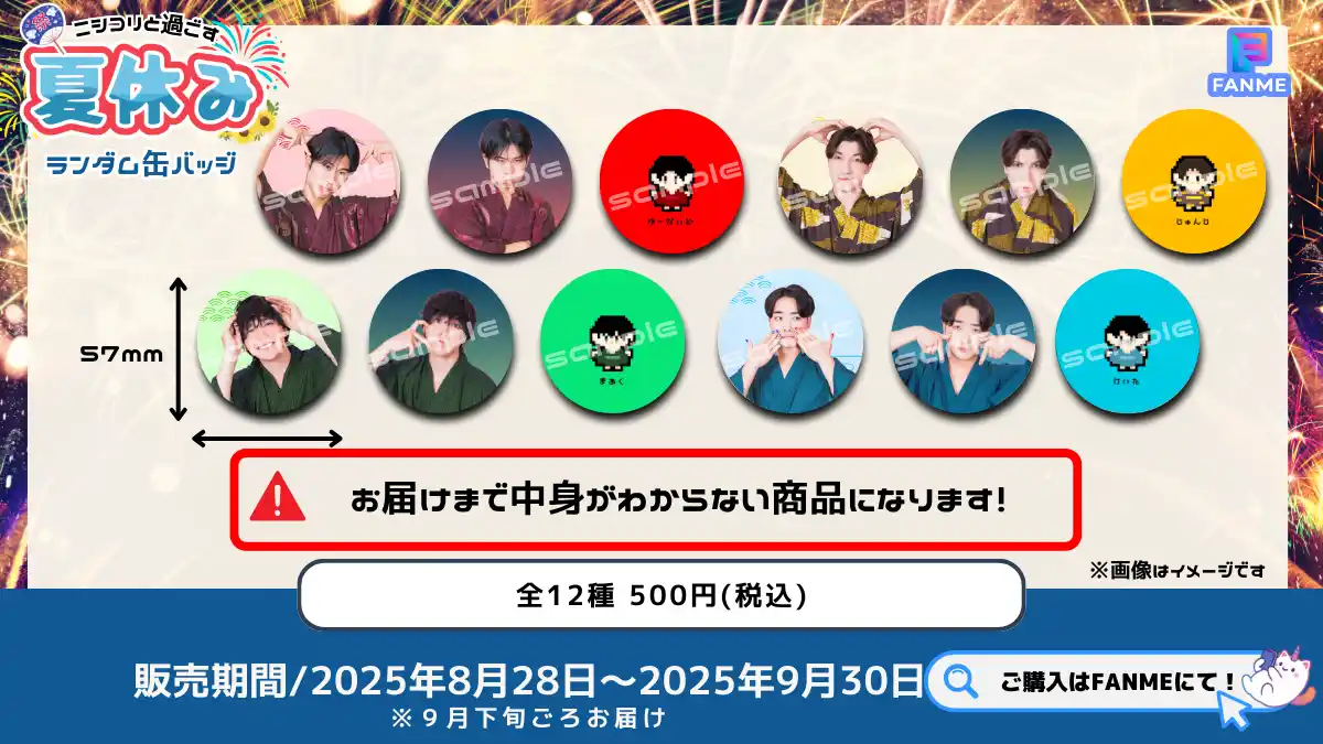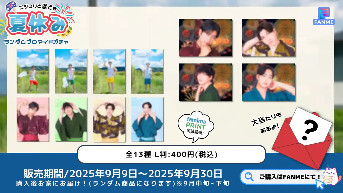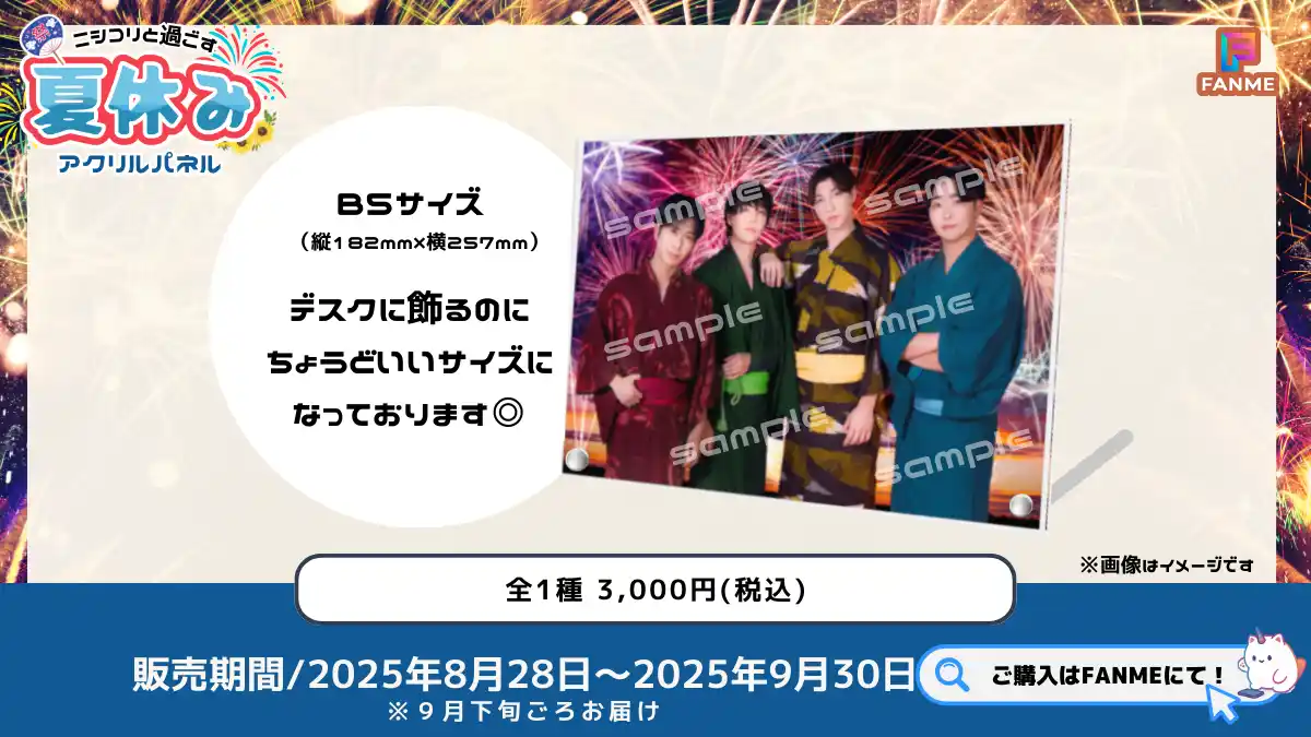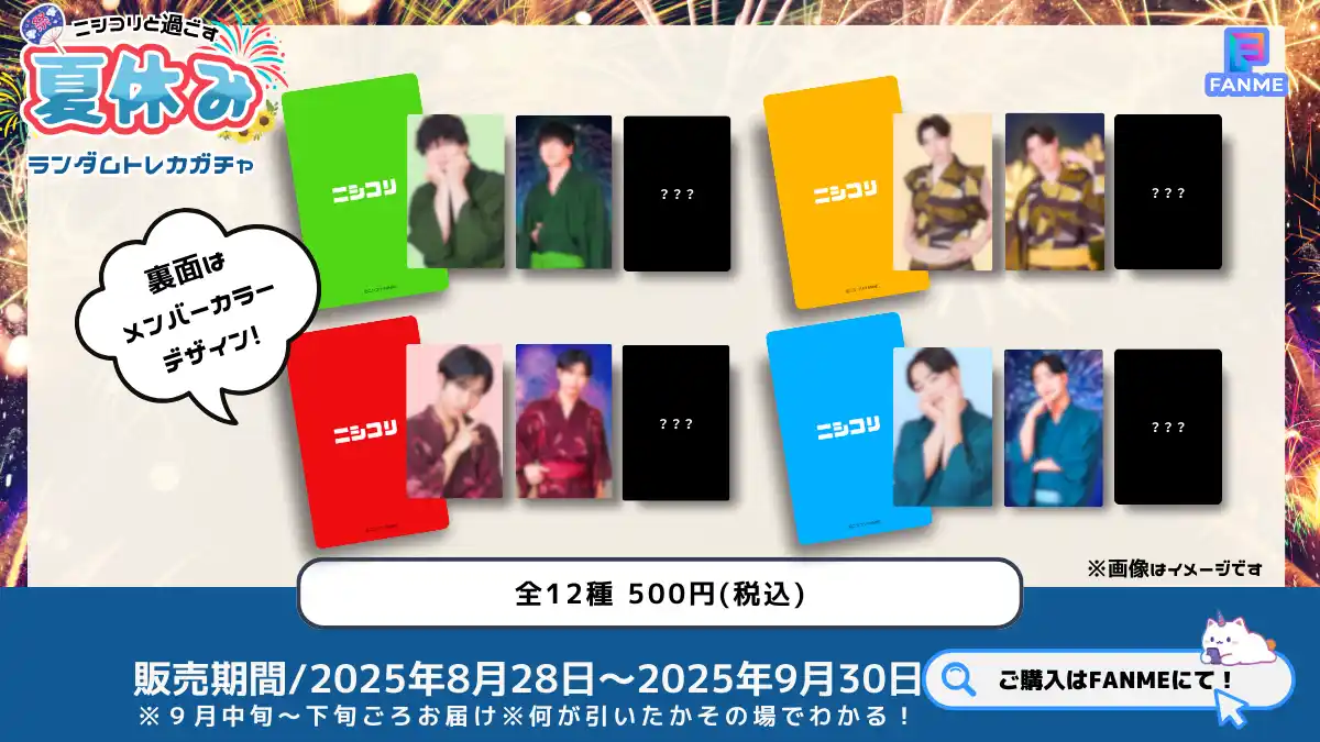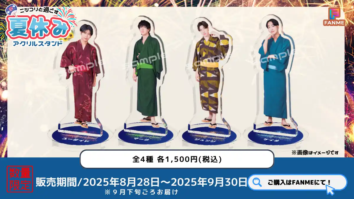 | 今回の新作グッズは、日本の夏を感じさせる浴衣姿をテーマに、様々なアイテムをご用意いたしました。アクリルスタンドやランダムブロマイドなど、全5種類のアイテムがラインナップ。ここでしか手に入らない特別なグッズで、ニシコリのメンバーたちとこの夏を楽しみましょう! | ||||||||||||