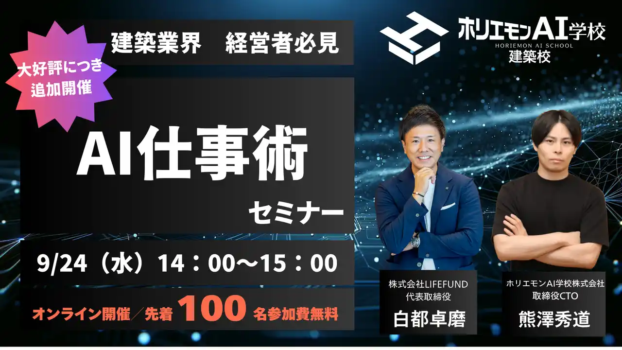 8/25に開催された「建築業界のための”即実践”AI仕事術セミナー」(主催:ホリエモンAI学校建築校/株式会社LIFEFUND)に、150名以上の方にご参加いただきました。 参加者アンケートでは 満足度90%以上 を記録し、多くの方から「業務効率化や人手不足解消のヒントが得られた」と高評価をいただきました。 |