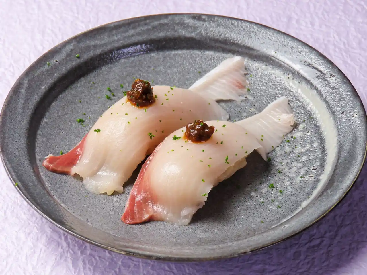 脂が乗り始めた函館産の鰤の握りは、味噌の旨みと柚子の香りが印象的な逸品です。 |