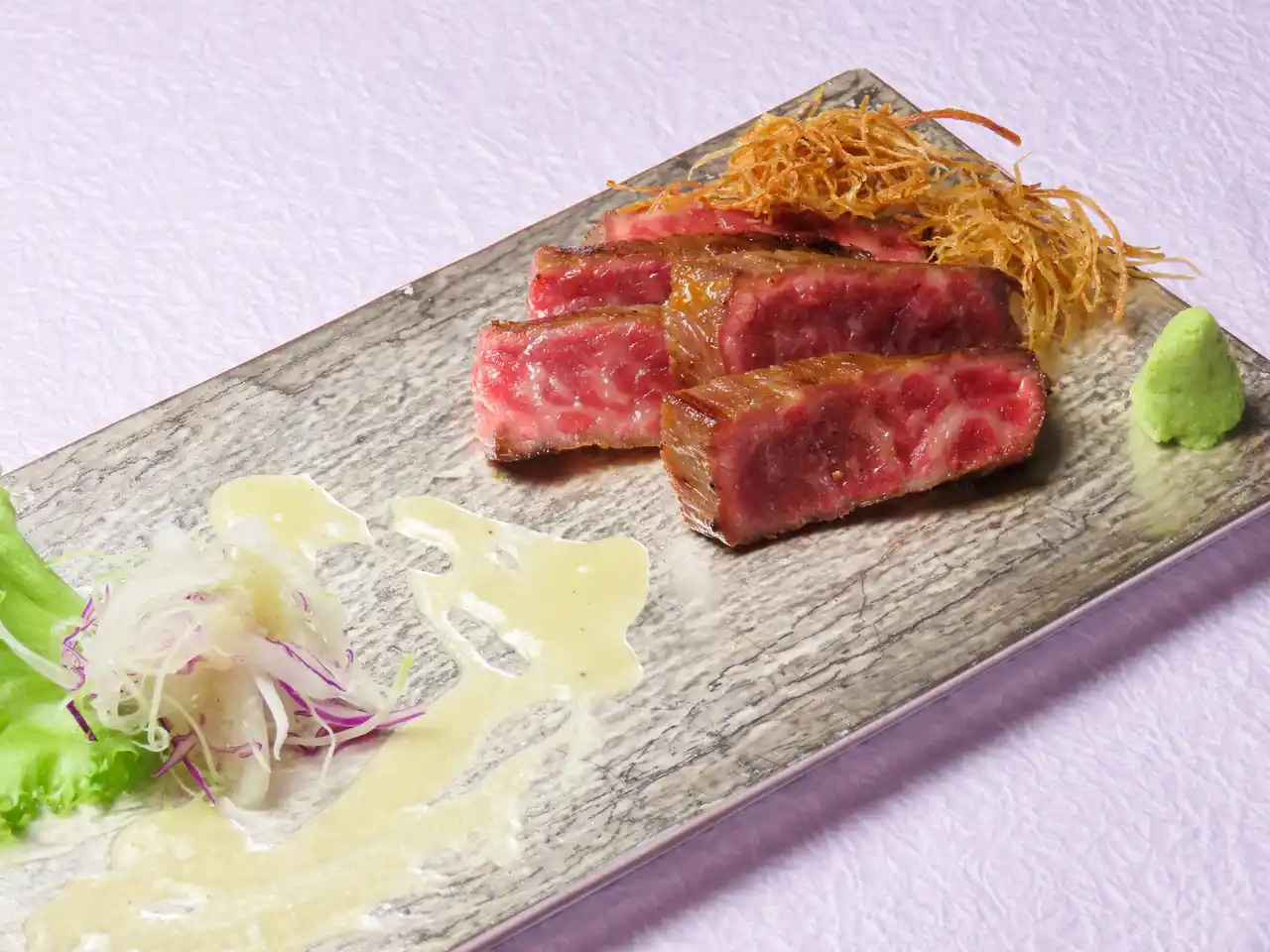 尾崎牛の味噌漬け焼き 山葵 彩千切り野菜 網牛蒡 塩麹ドレッシング |