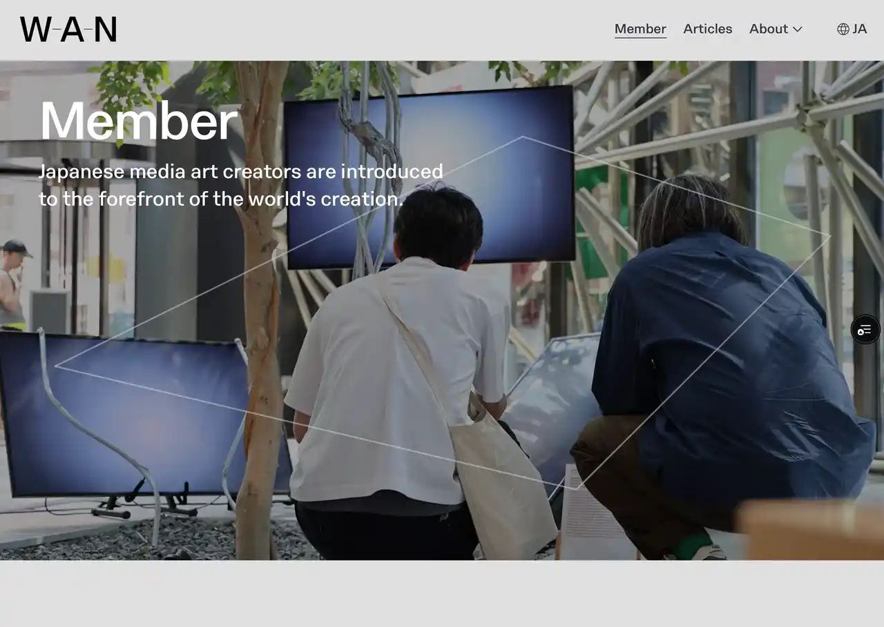 ウェブサイトでは、各採択作家の現地レポートやWAN TALKなどの動画コンテンツを発信し、海外展開を目指す日本のクリエイターに有益なコンテンツを提供します。日本のメディアアートの「いま」を伝えるプラットフォームとして、本分野のグローバルな発信力向上を目指します。 |